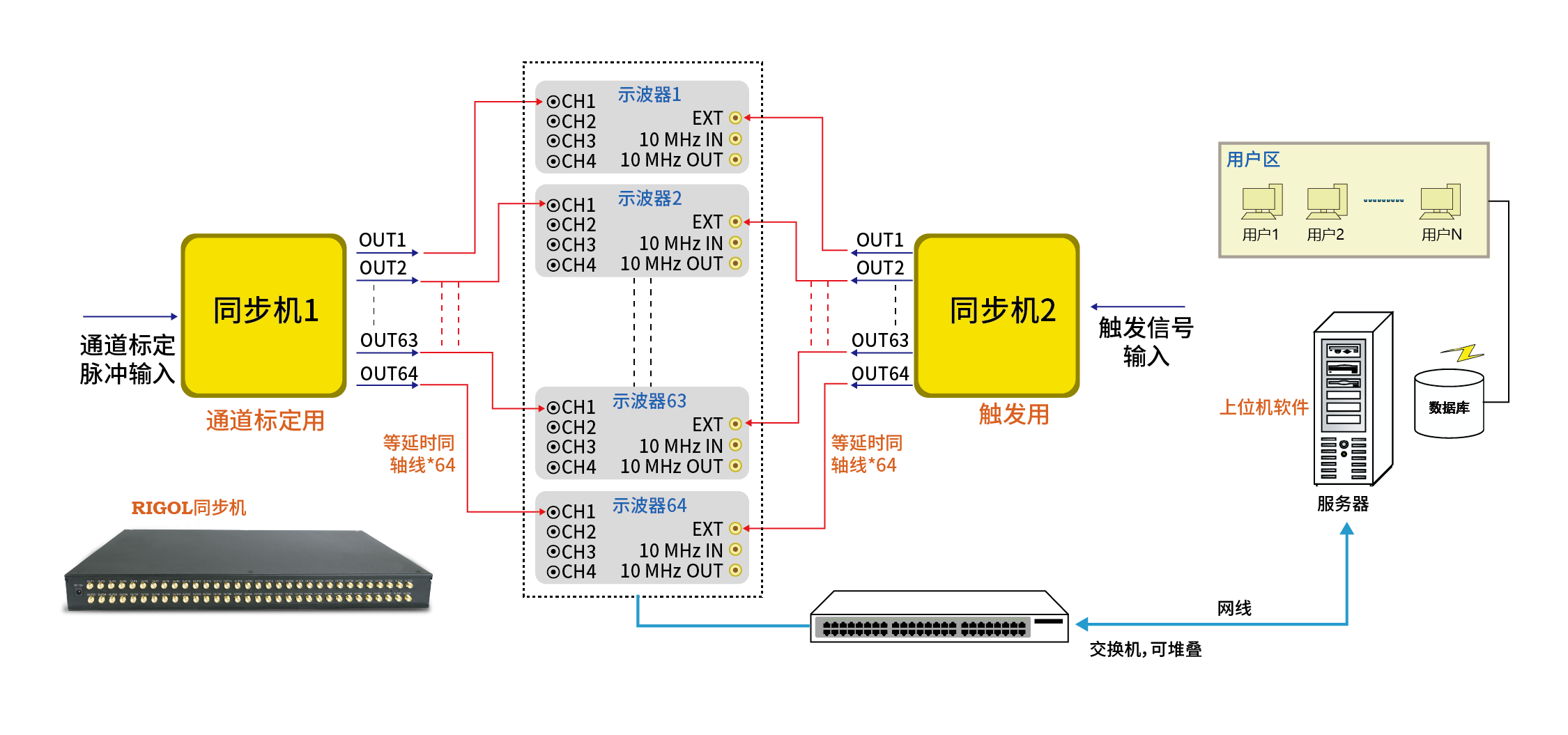 利用配套的同步机,可以提供多机同步触发方案,且可以实现现场校准,保证多通道同步观测要求
